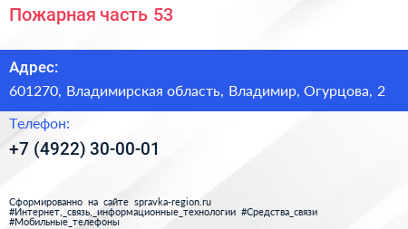 Пожарная часть №53 по адресу 601270, Владимирская область, Владимир, Огурцова, 2 в дальнейшем Организация, размещена в следующих категориях: