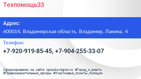 Техпомощь33 по адресу 600014, Владимирская область, Владимир, Лакина, 4 в дальнейшем Организация, размещена в следующих категориях: