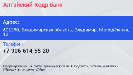 Алтайский Кедр, баня по адресу 601390, Владимирская область, Владимир, Молодёжная, 12 в дальнейшем Организация, размещена в следующих категориях: