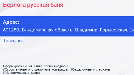 Берлога, русская баня по адресу 601280, Владимирская область, Владимир, Горьковская, 1а в дальнейшем Организация, размещена в следующих категориях: