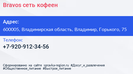 Bravos, сеть кофеен по адресу 600005, Владимирская область, Владимир, Горького, 75 в дальнейшем Организация, размещена в следующих категориях: