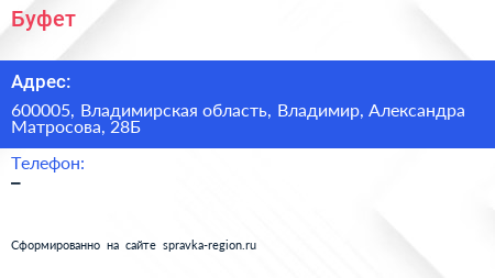 Буфет по адресу 600005, Владимирская область, Владимир, Александра Матросова, 28Б в дальнейшем Организация, размещена в следующих категориях: