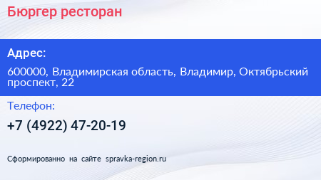 Бюргер, ресторан по адресу 600000, Владимирская область, Владимир, Октябрьский проспект, 22 в дальнейшем Организация, размещена в следующих категориях: