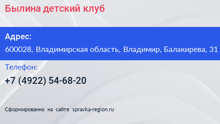 Былина, детский клуб по адресу 600028, Владимирская область, Владимир, Балакирева, 31 в дальнейшем Организация, размещена в следующих категориях: