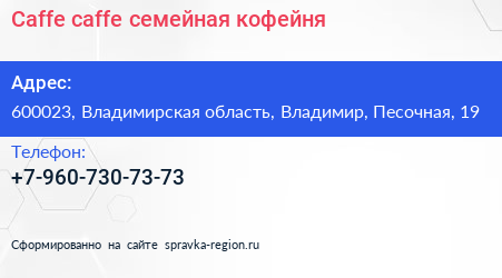 Caffe-caffe, семейная кофейня по адресу 600023, Владимирская область, Владимир, Песочная, 19 в дальнейшем Организация, размещена в следующих категориях: