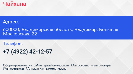 Чайхана по адресу 600000, Владимирская область, Владимир, Большая Московская, 22 в дальнейшем Организация, размещена в следующих категориях: