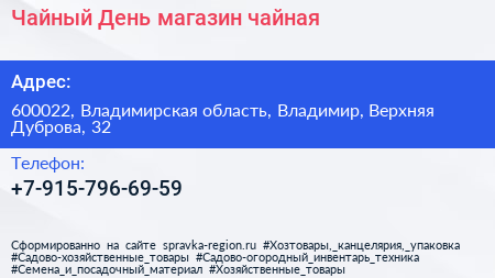 Чайный День, магазин-чайная по адресу 600022, Владимирская область, Владимир, Верхняя Дуброва, 32 в дальнейшем Организация, размещена в следующих категориях: