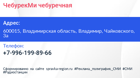 ЧебурекМи, чебуречная по адресу 600015, Владимирская область, Владимир, Чайковского, 3а в дальнейшем Организация, размещена в следующих категориях: