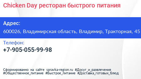 Chicken Day, ресторан быстрого питания по адресу 600026, Владимирская область, Владимир, Тракторная, 45 в дальнейшем Организация, размещена в следующих категориях: