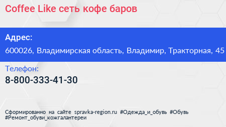 Coffee Like, сеть кофе-баров по адресу 600026, Владимирская область, Владимир, Тракторная, 45 в дальнейшем Организация, размещена в следующих категориях: