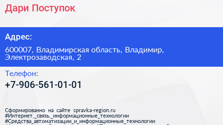 Дари-Поступок по адресу 600007, Владимирская область, Владимир, Электрозаводская, 2 в дальнейшем Организация, размещена в следующих категориях: