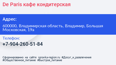 De Paris, кафе-кондитерская по адресу 600000, Владимирская область, Владимир, Большая Московская, 19а в дальнейшем Организация, размещена в следующих категориях: