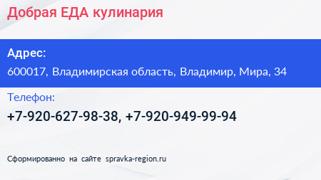 Добрая ЕДА, кулинария по адресу 600017, Владимирская область, Владимир, Мира, 34 в дальнейшем Организация, размещена в следующих категориях: