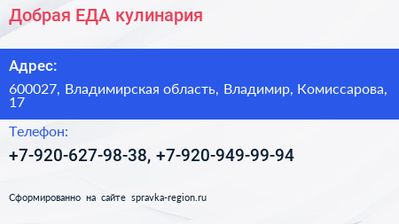 Добрая ЕДА, кулинария по адресу 600027, Владимирская область, Владимир, Комиссарова, 17 в дальнейшем Организация, размещена в следующих категориях:
