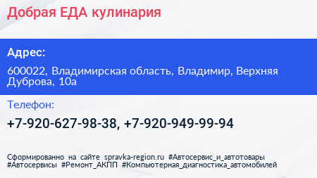 Добрая ЕДА, кулинария по адресу 600022, Владимирская область, Владимир, Верхняя Дуброва, 10а в дальнейшем Организация, размещена в следующих категориях: