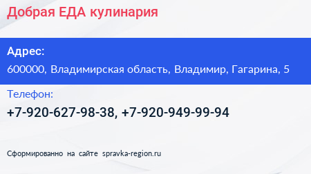 Добрая ЕДА, кулинария по адресу 600000, Владимирская область, Владимир, Гагарина, 5 в дальнейшем Организация, размещена в следующих категориях: