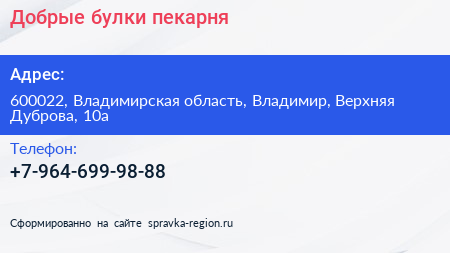 Добрые булки, пекарня по адресу 600022, Владимирская область, Владимир, Верхняя Дуброва, 10а в дальнейшем Организация, размещена в следующих категориях: