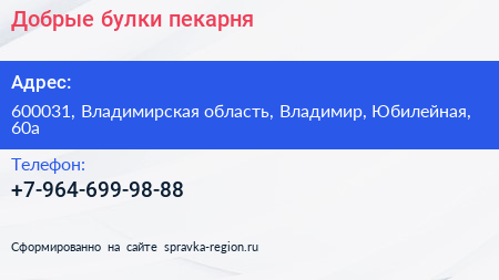 Добрые булки, пекарня по адресу 600031, Владимирская область, Владимир, Юбилейная, 60а в дальнейшем Организация, размещена в следующих категориях: