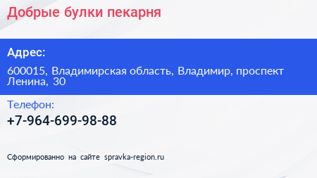 Добрые булки, пекарня по адресу 600015, Владимирская область, Владимир, проспект Ленина, 30 в дальнейшем Организация, размещена в следующих категориях: