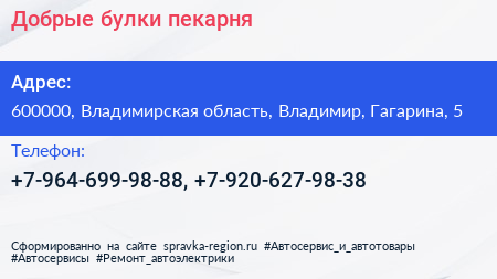 Добрые булки, пекарня по адресу 600000, Владимирская область, Владимир, Гагарина, 5 в дальнейшем Организация, размещена в следующих категориях: