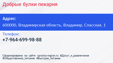 Добрые булки, пекарня по адресу 600000, Владимирская область, Владимир, Спасская, 1 в дальнейшем Организация, размещена в следующих категориях: