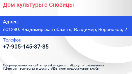 Дом культуры, с. Сновицы по адресу 601280, Владимирская область, Владимир, Вороновой, 2 в дальнейшем Организация, размещена в следующих категориях: