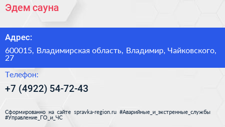 Эдем, сауна по адресу 600015, Владимирская область, Владимир, Чайковского, 27 в дальнейшем Организация, размещена в следующих категориях: