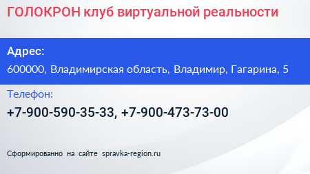 ГОЛОКРОН, клуб виртуальной реальности по адресу 600000, Владимирская область, Владимир, Гагарина, 5 в дальнейшем Организация, размещена в следующих категориях: