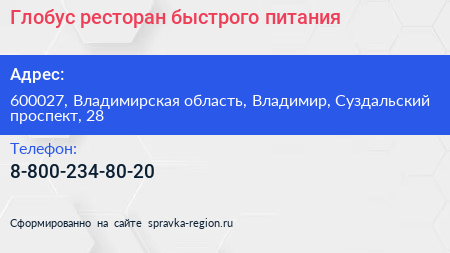 Глобус, ресторан быстрого питания по адресу 600027, Владимирская область, Владимир, Суздальский проспект, 28 в дальнейшем Организация, размещена в следующих категориях: