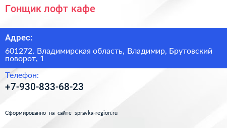 Гонщик, лофт-кафе по адресу 601272, Владимирская область, Владимир, Брутовский поворот, 1 в дальнейшем Организация, размещена в следующих категориях: