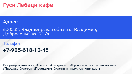 Гуси-Лебеди, кафе по адресу 600032, Владимирская область, Владимир, Добросельская, 217а в дальнейшем Организация, размещена в следующих категориях: