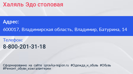 Халяль Эдо, столовая по адресу 600017, Владимирская область, Владимир, Батурина, 14 в дальнейшем Организация, размещена в следующих категориях: