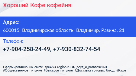 Хороший Кофе, кофейня по адресу 600015, Владимирская область, Владимир, Разина, 21 в дальнейшем Организация, размещена в следующих категориях: