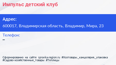 Импульс, детский клуб по адресу 600017, Владимирская область, Владимир, Мира, 23 в дальнейшем Организация, размещена в следующих категориях: