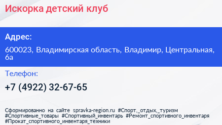 Искорка, детский клуб по адресу 600023, Владимирская область, Владимир, Центральная, 6а в дальнейшем Организация, размещена в следующих категориях: