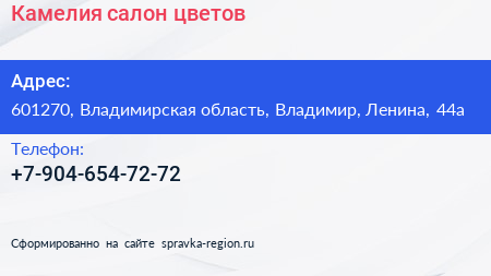 Камелия, салон цветов по адресу 601270, Владимирская область, Владимир, Ленина, 44а в дальнейшем Организация, размещена в следующих категориях: