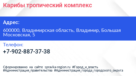 Карибы, тропический комплекс по адресу 600000, Владимирская область, Владимир, Большая Московская, 5 в дальнейшем Организация, размещена в следующих категориях: