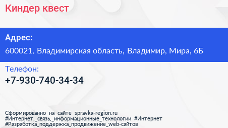 Киндер-квест по адресу 600021, Владимирская область, Владимир, Мира, 6Б в дальнейшем Организация, размещена в следующих категориях: