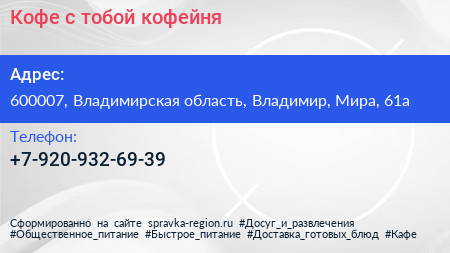 Кофе с тобой, кофейня по адресу 600007, Владимирская область, Владимир, Мира, 61а в дальнейшем Организация, размещена в следующих категориях: