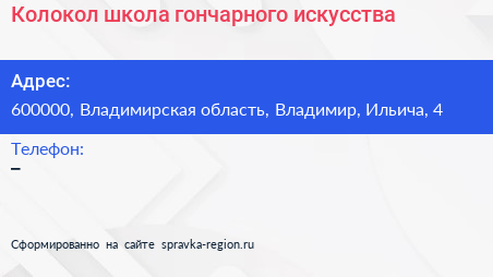 Колокол, школа гончарного искусства по адресу 600000, Владимирская область, Владимир, Ильича, 4 в дальнейшем Организация, размещена в следующих категориях: