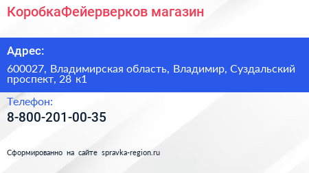 КоробкаФейерверков, магазин по адресу 600027, Владимирская область, Владимир, Суздальский проспект, 28 к1 в дальнейшем Организация, размещена в следующих категориях: