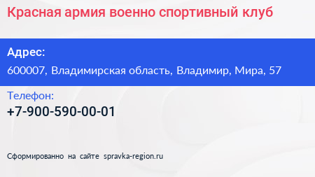 Красная армия, военно-спортивный клуб по адресу 600007, Владимирская область, Владимир, Мира, 57 в дальнейшем Организация, размещена в следующих категориях: