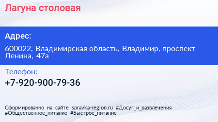 Лагуна, столовая по адресу 600022, Владимирская область, Владимир, проспект Ленина, 47а в дальнейшем Организация, размещена в следующих категориях:
