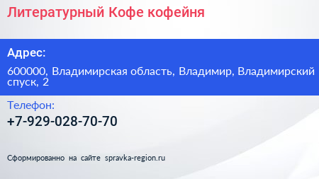 Литературный Кофе, кофейня по адресу 600000, Владимирская область, Владимир, Владимирский спуск, 2 в дальнейшем Организация, размещена в следующих категориях: