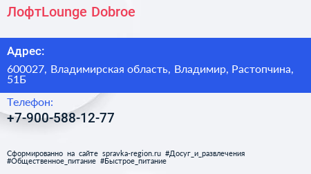 ЛофтLounge Dobroe по адресу 600027, Владимирская область, Владимир, Растопчина, 51Б в дальнейшем Организация, размещена в следующих категориях: