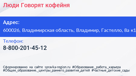 Люди Говорят, кофейня по адресу 600026, Владимирская область, Владимир, Гастелло, 8а к1 в дальнейшем Организация, размещена в следующих категориях:
