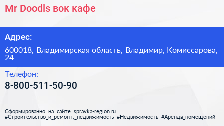 Mr Doodls, вок-кафе по адресу 600018, Владимирская область, Владимир, Комиссарова, 24 в дальнейшем Организация, размещена в следующих категориях: