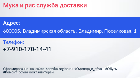 Мука и рис, служба доставки по адресу 600005, Владимирская область, Владимир, Поселковая, 1 в дальнейшем Организация, размещена в следующих категориях: