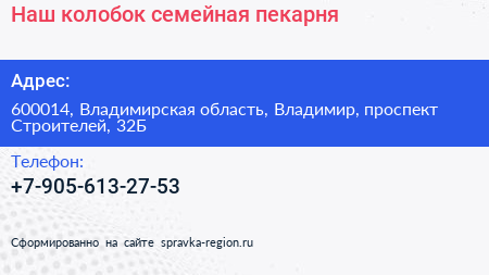 Наш колобок, семейная пекарня по адресу 600014, Владимирская область, Владимир, проспект Строителей, 32Б в дальнейшем Организация, размещена в следующих категориях: