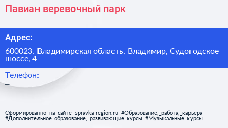 Павиан, веревочный парк по адресу 600023, Владимирская область, Владимир, Судогодское шоссе, 4 в дальнейшем Организация, размещена в следующих категориях: